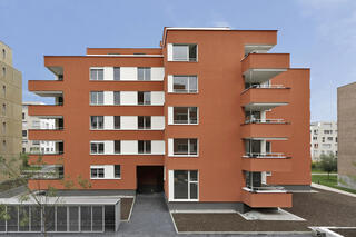 Dank ihrer windmühlenartigen Anordnung besitzen alle Wohnungen drei Fassaden und Ausblick in drei Himmelsrichtungen. Diese Grundfigur eines Baukörpers erlaubt im Gegenzug die frei auskragenden und stützenfreien Loggien. Farblich wird die Anlage in einem erdigen Sienarot gehalten. Der zurückgesetzte Sockel ist anthrazitfarben.