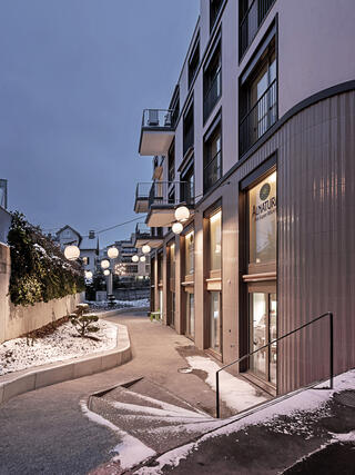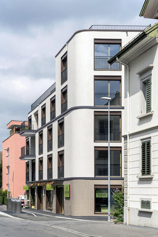 In seiner ungewöhnlichen Volumetrie und Materialisierung bildet das Gebäude einen neuen sichtbaren Auftakt zur Hauptstrasse. Dabei übernimmt es die Höhenstaffelung der Dachtraufen und Lochfenster seiner Nachbarhäuser. Dadurch und mit seinen abgerundeten Ecken fügt sich der Neubau sanft in das bestehende Strassenbild ein.
