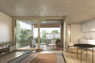 Von der Strasse zum Wald hin entsteht ein sanfter, gradueller Übergang über verschiedene Zonen und Öffentlichkeitsgrade hinweg. Zahlreiche Treffpunkte mit unterschiedlicher Ausstattung bieten den Bewohnern, den Besitzern der angrenzenden Kleingärten und der gesamten Nachbarschaft vielfältige Möglichkeiten zum gemeinschaftlichen Aufenthalt, Spielen oder Gärtnern. Die Wohnungen selbst verfügen alle über einen nach Süd-Südwesten ausgerichteten Balkon. Dieser lenkt den Blick Richtung Waldrand und ist der Fokus jeder einzelnen Wohnung. Trotz der scheinbar freien Aussenform und der unterschiedlichen Gebäudelänge sind die Wohnungsgrundrisse mit drei Grundtypen modular aufgebaut. Eine energetisch und im CO2-Ausstoss nachhaltige Holzfassade unterstützt die Stimmung einer Siedlung am Waldrand. Ein markantes Dach bietet Witterungsschutz, stellt eine Verbindung zu den vorherrschenden Satteldächern her und definiert eine neue Traufhöhe im Quartier.