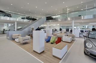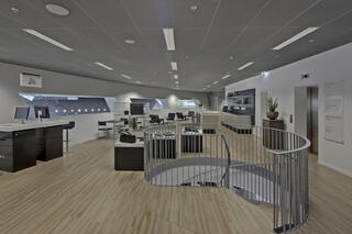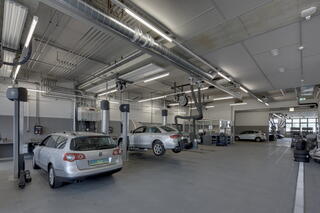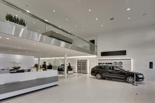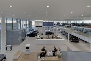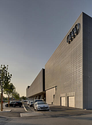 In an easily reachable location in Dübendorf, the AMAG planned a new automobile centre for four makes of car. As the plot is quite small, the two-storey entrance area is used exclusively for customer contact. All the storage and workshop functions were moved to the upper floors, where together they form a large projecting element that shelters the outer arrivals area. For visitors, the arcade forms a clear address.