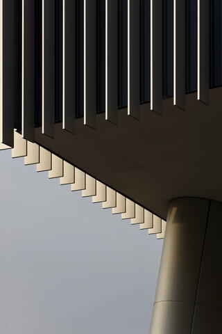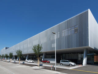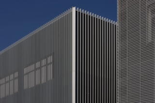 In contrast to the building’s glazed base, on the upper floors a semi-transparent metal construction extends across the different uses, combining them in design terms to form a single entity. On the one hand this “veil” of vertical, natural anodised aluminium slats provides shade and directs light into the very deep workspaces, while on the other it makes the upper part of the building seem abstract, which gives the volume the necessary calm and lightness and focuses attention on the two sales floors.