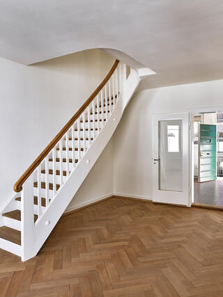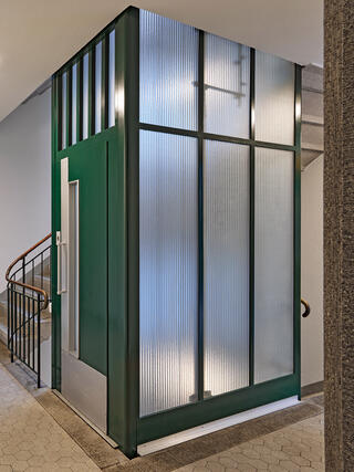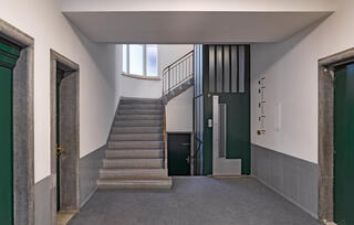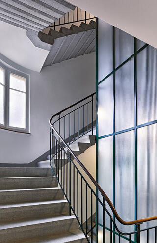 The gentle renovation uncovered the building’s original qualities. Particular attention was paid to those characteristic features dating from the time the building was erected, for instance the staircase with its carefully considered colour concept and typical elevator. Despite the fire safety measures that were required it proved possible to retain many of the formal design elements.