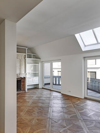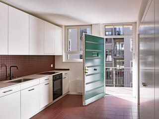 Apart from a few maisonette apartments on the upper floors, the 31 units are made up of small apartments. In addition, there is a commercial space on the ground floor. Subtle shifts in the plan are oriented on the earlier layout while, on the other hand, also responding to current needs. For example: narrower corridor areas were replaced by generously dimensioned kitchen/dining spaces, while existing large apartments were divided up into smaller units. Three apartments were given a small new balcony.