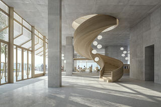 In the entrance to the new National Library visitors are met by a winding, free-standing wooden staircase that leads up to the first floor of the open library, and by a reception desk, also freely placed in the open system of spaces between the children’s library and the café. The existing lift and staircase core serves as the central circulation for all storeys, while spiral staircases additionally connect the various public areas with each other and generate a sequence of spaces that leads up to the roof terrace.