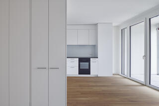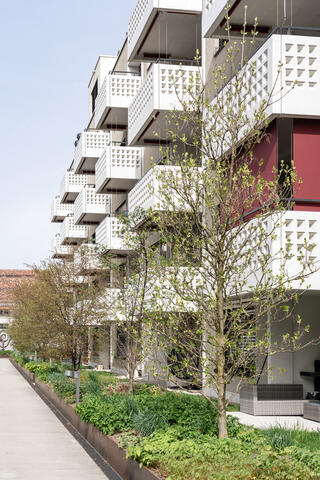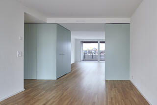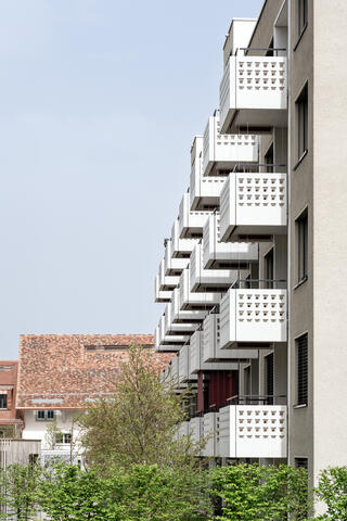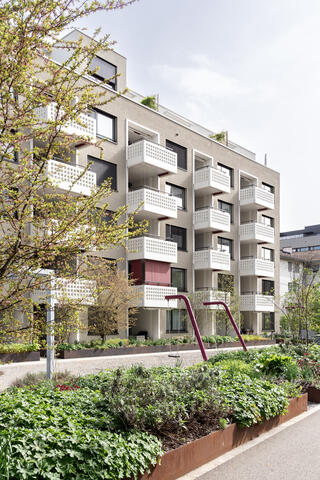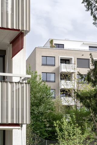 The series of historic farmhouses along Wallisellenstrasse, which is important in terms of urban design and the appearance of the town, is enriched by the creation of a local public space in front of the protected building on plot B. The conversion of this listed building was not undertaken by Fischer Architekten.
